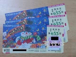 先日、知り合いの女性の方に会いました。 『 Z−Zさぁ〜ん♪ 』 と向かい側の歩道からこちらに手を振っています。 少し恥ずかしい気持ちになり・ 「 子供やないんやから・ 」 などと思っていると 信号が変わりこちらへ女性が駆け寄って来ました。 『 年末ジャンボは買ってませんよねぇ? 』 と女性。 『 買ってないけど・ なんで???・ 』 と管理人・・ ( ちょ〜クジ運が無い管理人は宝くじなど買いません・ モッタイナイ・ ) よく話を聞いてみると・ 沢山買い過ぎたそうで少しでも要らないかとのこと・・ 『 3枚くらいやったらいいよぉ・ 』 と管理人・ 『 それじゃ〜1000円で 』 ということで別れました。 いざ宝くじを手にしてみると 「 少しでも当たれば良いな 」 と思うものですね。 「 もしかしたら1当が当たるかも 」 「 せめて一千万円でも当たれば 」 などと思われるからこそきっと皆さんは買われるのでしょうね。