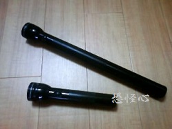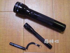 ↑ 画像内の上の物がDタイプの6セルのマグライトです。 下の同タイプの2セルの物と比べるとその長さがよく分かると思います。 4セルくらいが妥当かな?とも思いましたが・ 最長の物を購入してしまいました・・ 長くて凄くカッコイイのですが・ 長いし・ 重いし・ やはり使い勝手は・・・・・・ ( 長さは約50cm・ 乾電池を含む総重量は・・ 約1.35kgにもなるのですよ・・・ ) ですが・ 太くて長くて・・ とても魅力的でお気に入りのライトです♪ 「 6セルのLED?・ 」 などと思われた方もおられるのではないでしょうか? もともと6セルのマグライトはLEDの物は販売されていないので 管理人の物は他社製のLED交換球に替えてあります。 ( やはり現在のLEDは明るさなどにも不満がなくてとても経済的ですからね♪ ) でも・ LEDはまだまだ高価ですね・ 他社の物なので保障も対象外ですし・・・ 実は・ Dタイプの6セルマグライトはもう1つ所有しています。 同じ日に購入したもう1つの物は封も開けずにそのまま置いてあります。 収集癖?・ コレクター心?・ がある管理人の悪い癖なのですが・・・ でも・ 新品のまま持っていれば・ これからプレミア必至ですよねっ(^^ゞ?・ もう・ 在庫限りで・・ 本当に無くなってしまう物なのですから・・・・・・ ( 今のうちに5セルも購入しておこうかな?・ なんて思いますね(^^ゞ )